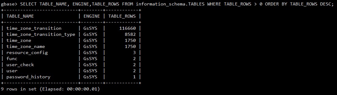 用Python代码通过 GBase Python 接口来连接 GBase 8a 数据库,并查询数据库中表数据大于0的表,按表数据行数逆序排序,展示表名、表引擎、表行数三个字段。