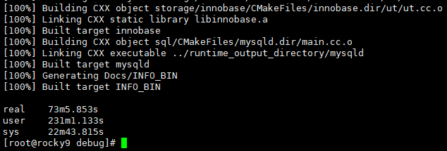 [root@rocky9 debug]# grep Built make.log [ 1%] Built target INFO_SRC [ 1%] Built target stack_direction [ 1%] Built target abi_check [ 1%] Built target lz4_lib [ 2%] Built target zlib_objlib [ 2%] Built target icustubdata [ 3%] Built target zstd_objlib [ 5%] Built target uca9dump [ 8%] Built target vio_objlib [ 8%] Built target libprotobuf-lite [ 11%] Built target mytime_objlib [ 11%] Built target mysql_gtid [ 14%] Built target all_sys_schema [ 14%] Built target comp_sql [ 14%] Built target gen_lex_hash [ 14%] Built target GenBootstrapPriv [ 14%] Built target GenFixPrivs [ 14%] Built target libedit_emacs [ 14%] Built target libedit_vi [ 14%] Built target libedit_common [ 15%] Built target libedit_help [ 15%] Built target libedit_func [ 15%] Built target event_pthreads [ 16%] Built target event_core [ 18%] Built target build_id_test [ 18%] Built target icuuc [ 19%] Built target mysys_objlib [ 20%] Built target mysqlservices [ 20%] Built target oci_common_objlib [ 20%] Built target GenLiteProtos [ 20%] Built target library_mysys [ 20%] Built target decimal_objlib [ 20%] Built target zlib [ 20%] Built target mysqltest_safe_process [ 20%] Built target zstd [ 20%] Built target strings_ja_hans [ 20%] Built target strings_zh_hans [ 20%] Built target vio [ 21%] Built target mytime [ 22%] Built target sql_commands [ 22%] Built target GenServerSource [ 22%] Built target libedit_fcns [ 23%] Built target event_openssl [ 23%] Built target event_extra [ 25%] Built target changestreams_standalone_static [ 25%] Built target oci_common [ 25%] Built target decimal [ 25%] Built target GenSysSchemaC [ 27%] Built target mysql_binlog_event_standalone [ 27%] Built target icui18n [ 27%] Built target GenSysSchema [ 28%] Built target gen_keyword_list [ 28%] Built target gen_lex_token [ 29%] Built target mysqlgcs [ 29%] Built target GenKeywordList [ 29%] Built target GenDigestServerSource [ 31%] Built target edit [ 31%] Built target strings_objlib [ 32%] Built target strings [ 32%] Built target strings_shared [ 32%] Built target conf_to_src [ 32%] Built target mysys [ 32%] Built target comp_err [ 32%] Built target thr_lock [ 33%] Built target mf_iocache_test [ 34%] Built target mysql_ssl_rsa_setup [ 34%] Built target comp_client_err [ 34%] Built target my_print_defaults [ 34%] Built target lz4_decompress [ 34%] Built target zlib_decompress [ 34%] Built target GenError [ 34%] Built target GenClientError [ 34%] Built target range_check_err [ 34%] Built target perror [ 34%] Built target mysql_tzinfo_to_sql [ 34%] Built target udf_example [ 34%] Built target locking_service [ 34%] Built target csv [ 34%] Built target libprotobuf [ 37%] Built target heap_library [ 37%] Built target mysql_binlog_event [ 38%] Built target myisammrg [ 38%] Built target ngram_parser [ 38%] Built target temptable [ 39%] Built target mysql_native_password [ 40%] Built target minchassis [ 40%] Built target myisam_library [ 40%] Built target installed_headers [ 41%] Built target archive [ 42%] Built target clientlib_objlib [ 43%] Built target blackhole [ 44%] Built target example [ 44%] Built target federated [ 46%] Built target innodb_zipdecompress [ 46%] Built target myisam_ftdump [ 46%] Built target myisamchk [ 46%] Built target mysql_server_component_services [ 46%] Built target myisamlog [ 46%] Built target myisampack [ 46%] Built target test_security_context [ 46%] Built target audit_null [ 46%] Built target auth [ 46%] Built target qa_auth_client [ 46%] Built target auth_test_plugin [ 46%] Built target mock [ 46%] Built target qa_auth_server [ 46%] Built target qa_auth_interface [ 46%] Built target mysql_no_login [ 46%] Built target auth_socket [ 46%] Built target daemon_example [ 46%] Built target ddl_rewriter [ 46%] Built target ftexample [ 46%] Built target connection_control [ 46%] Built target clone [ 46%] Built target keyring_udf [ 47%] Built target validate_password [ 47%] Built target pfs_example_plugin_employee [ 48%] Built target rewrite_example [ 48%] Built target replication_observers_example [ 48%] Built target rewriter [ 48%] Built target keyring_file [ 48%] Built target semisync_source [ 48%] Built target semisync_replica [ 50%] Built target semisync_master [ 50%] Built target conflicting_variables [ 51%] Built target semisync_slave [ 51%] Built target test_sql_replication [ 51%] Built target test_sql_reset_connection [ 51%] Built target test_sql_sqlmode [ 51%] Built target test_sql_lock [ 51%] Built target test_sql_commit [ 51%] Built target test_session_attach [ 51%] Built target test_session_detach [ 51%] Built target test_sql_stmt [ 51%] Built target test_sql_complex [ 51%] Built target test_sql_processlist [ 51%] Built target test_sql_errors [ 51%] Built target test_x_sessions_deinit [ 51%] Built target test_sql_stored_procedures_functions [ 51%] Built target test_session_info [ 51%] Built target test_x_sessions_init [ 51%] Built target test_sql_all_col_types [ 51%] Built target test_sql_views_triggers [ 51%] Built target test_sql_2_sessions [ 51%] Built target test_session_in_thd [ 51%] Built target test_sql_shutdown [ 51%] Built target test_sql_sleep_is_connected [ 51%] Built target test_sql_cmds_1 [ 51%] Built target test_services_host_application_signal [ 51%] Built target test_services_thread [ 51%] Built target test_framework [ 51%] Built target test_services_plugin_registry [ 52%] Built target test_services [ 52%] Built target test_services_command_services [ 52%] Built target test_udf_services [ 52%] Built target version_token [ 52%] Built target component_audit_api_message_emit [ 52%] Built target component_example_component1 [ 52%] Built target component_example_component2 [ 53%] Built target component_example_component3 [ 53%] Built target component_test_string_service_charset [ 54%] Built target component_test_string_service [ 54%] Built target component_test_string_service_long [ 54%] Built target component_test_backup_lock_service [ 54%] Built target component_log_sink_test [ 55%] Built target component