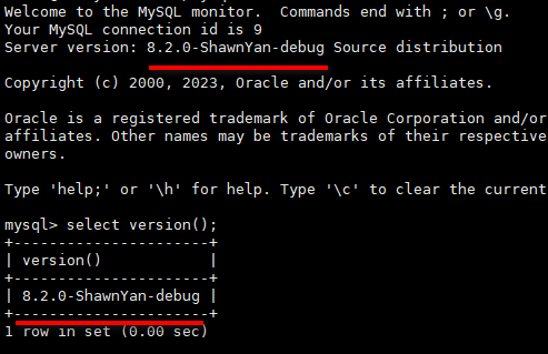 Type 'help;' or '\h' for help. Type '\c' to clear the current input statement. mysql> select version(); +----------------------+ | version() | +----------------------+ | 8.2.0-ShawnYan-debug | +----------------------+ 1 row in set (0.00 sec)